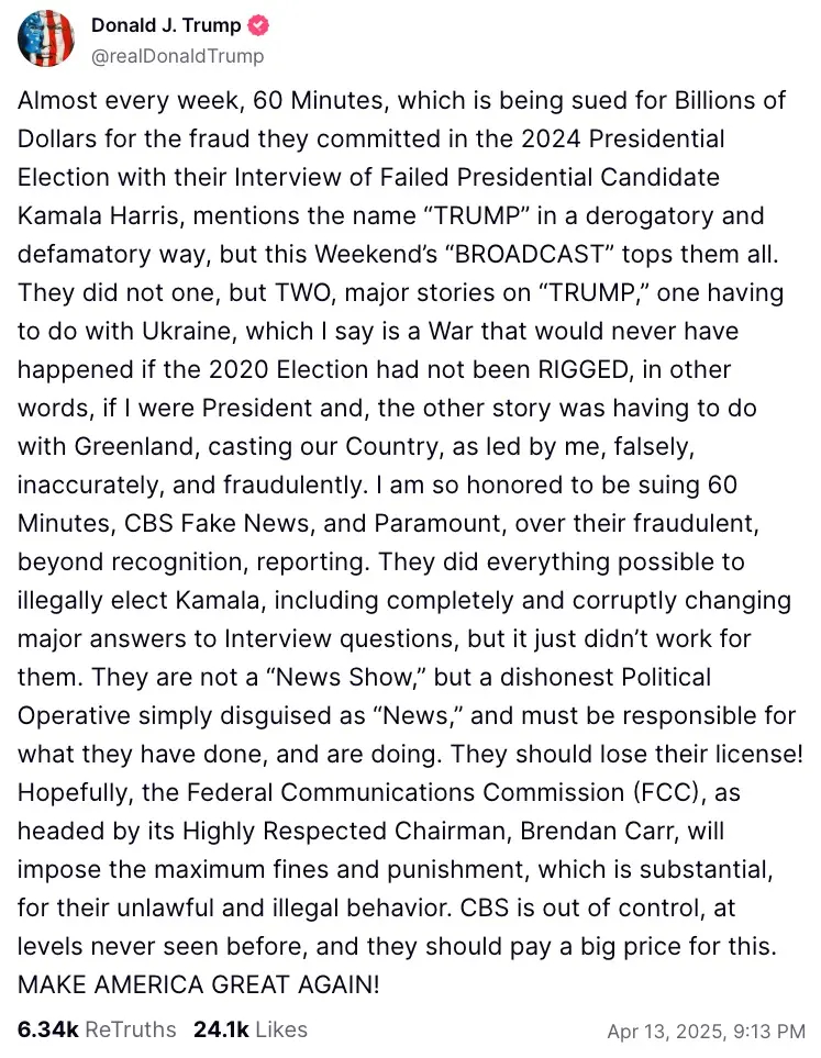 Trump urging FCC Chair to punish CBS to the max is ‘right out the authoritarian playbook
