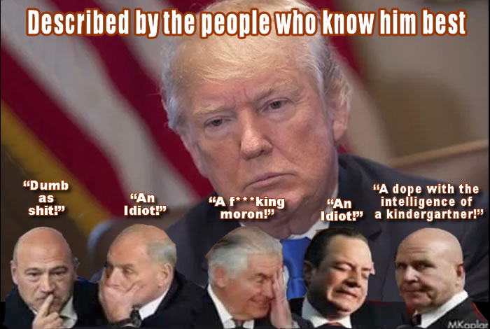 According to news reports & various sources, White House Staffers & Cabinet Members claimed Trump is “an Idiot”, “a f***ing moron”, “dumb as shit”, “dope with the intelligence of a kindergartner”, “like an 11 year old child”, “a professional liar”, “thinks he God”, “he tries to divide us”, “don’t think he’s fit for office”, was unable to stay focused, had a 2 minute attention span and required a ‘Special Folder’ with flattering news and photos about himself twice a day. Former DHS official Miles Taylor stated Trump was “Incandescently stupid”, that he had to “dumb down” classified memos so Trump could understand them and what he saw firsthand terrified him. National Security Advisor John Bolton stated World Leaders considered Trump to be a “laughing fool”.