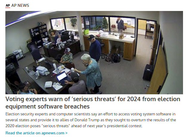 Per the above article: An effort to access voting system software in several states and provide it to allies of former President Donald Trump as they sought to overturn the results of the 2020 election has raised “serious threats” ahead of next year’s presidential contest, according to a group of experts who urged federal agencies to investigate.