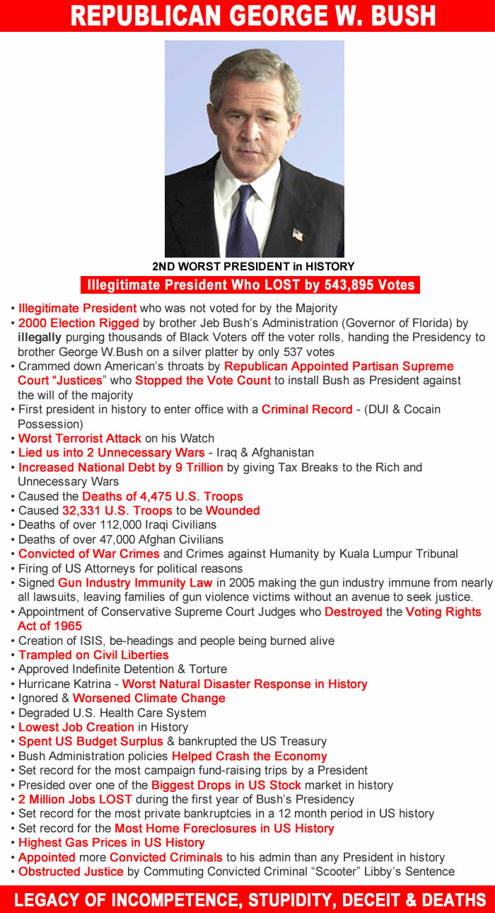 The dysfunctional U.S. Government is responsible for Bush & Trump being President because the antiquated, anti-democratic Electoral College violates Democracy and the wishes of the majority of voters by allowing a candidate who receives the least votes, to be installed as President; George W. Bush lost by 543,895 votes in 2000 and Donald Trump lost by 2.8 million in 2016.