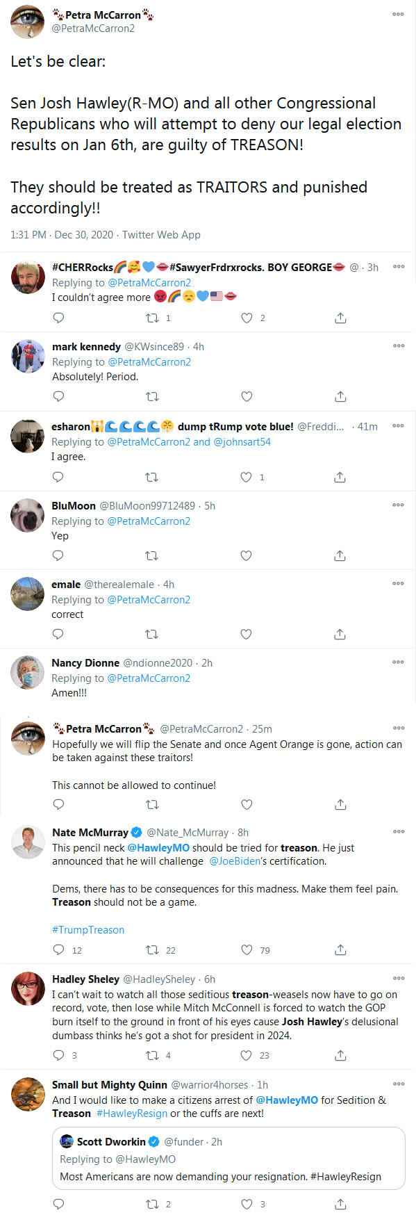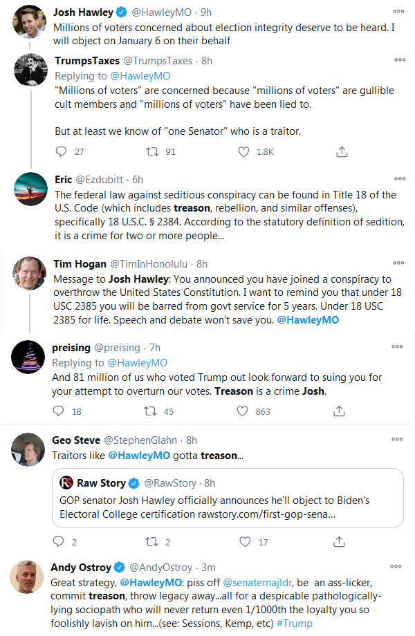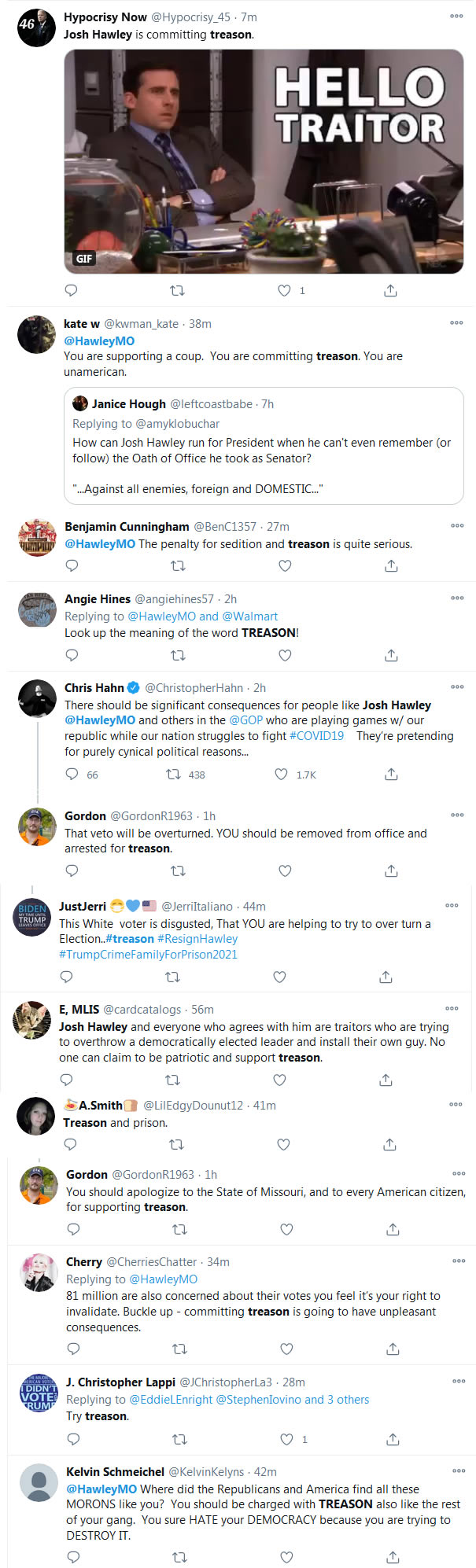 Below are copies of TONS of tweets from people calling Josh Hawley a TRAITOR and saying he should RESIGN.