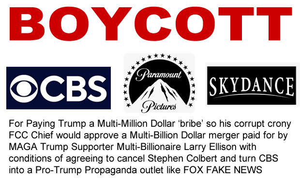 CBS, SkyDance & Paramount should be boycotted for being bought by Radical Right Wing MAGA Trump supporter Multi-Billionaire Larry Ellison who is turning CBS into a Pro-Trump Propaganda outlet like FOX FAKE NEWS