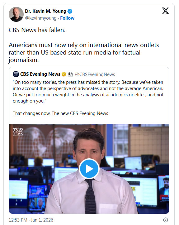 CBS News has fallen,” Dr. Kevin Young wrote in a post to X, following the anchor’s social media PSA video. “Americans must now rely on international news outlets rather than US based state run media for factual journalism.”
