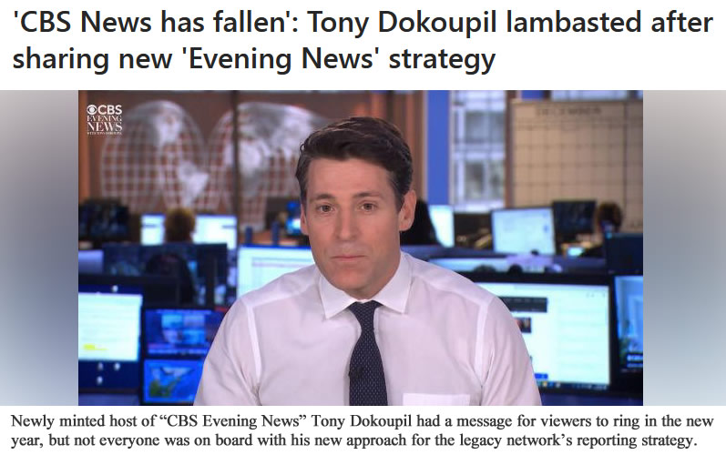 Per the above article: Newly minted host of “CBS Evening News” Tony Dokoupil had a message for viewers to ring in the new year, but not everyone was on board with his new approach for the legacy network’s reporting strategy.