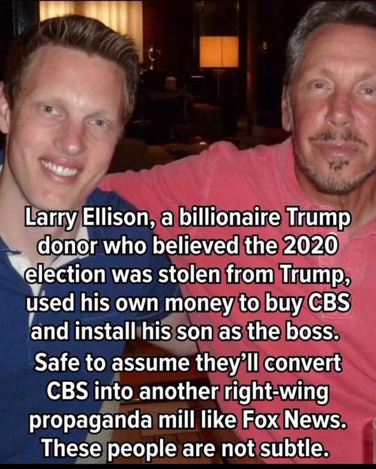 Per the photo above which is being shared on Social Media; “Billionaire Larry Ellison who believed the 2020 election was stolen from Trump used his own money to buy CBS and install his son as the boss”