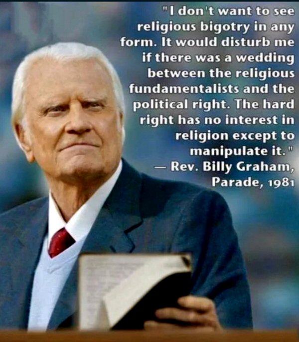 Billy Graham (who my dad admired) was smart enough to know that Politics and Religion don’t mix. IMO, Franklin Graham is behaving like a Political Hack and will never hold a candle to his dad.