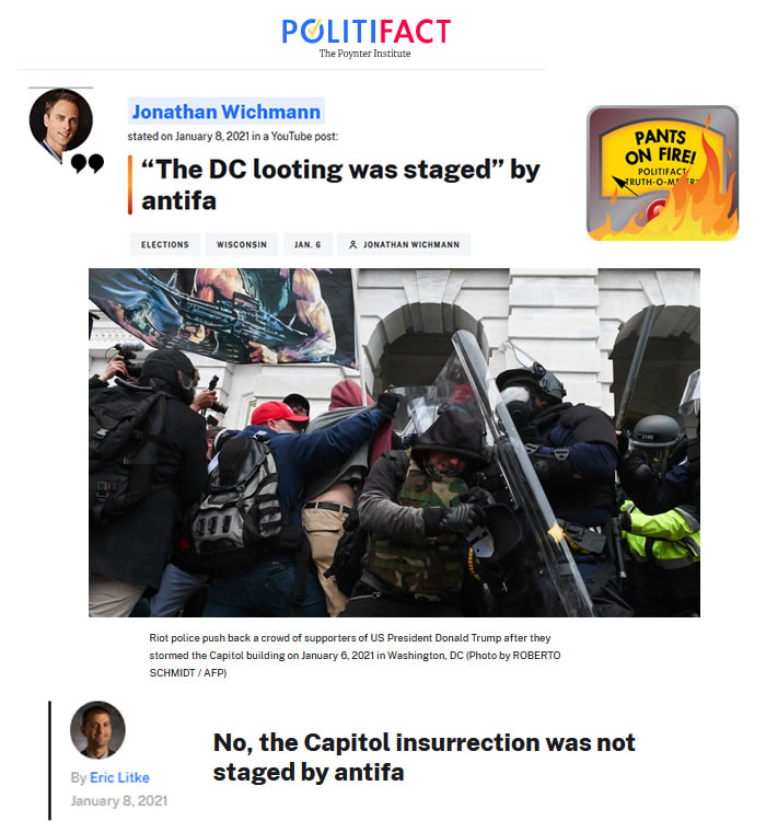 Let’s be clear — this is completely fabricated. Nevertheless, this line of thought has pervaded social media, amplified by prominent voices such as Texas Attorney General Ken Paxton and U.S. Rep. Mo Brooks, R-Alabama. PolitiFact National rated claims from both Pants on Fire. [source: politifact.com/factchecks/2021/jan/08/jonathan-wichmann/no-capitol-insurrection-was-not-staged-antifa]