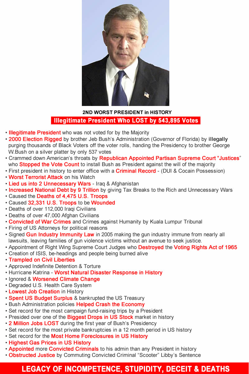1. He stole the presidency in 2000. Republicans in Florida purged more than 50,000 African-American voters before Election Day, and then went to the Supreme Court where the GOP-appointed majority stopped a recount that would have awarded the presidency to Vice-President Al Gore if all votes were counted. National news organizations verified that outcome long after Bush had been sworn in.