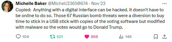 To the detriment of our country and to everyone who voted for Harris, she chose to ignore Computer Security Experts warnings and do nothing. In doing so, she played right into Republican’s and Trump’s hands, ensuring he would be sworn in as President without any investigations.