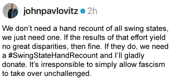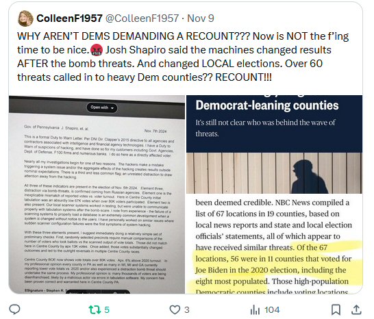 There’s posts all over the internet from citizens who demanded recounts in Swing States where bomb threats occurred, yet Harris & Democrats IGNORED demands for Recounts in Swing States.