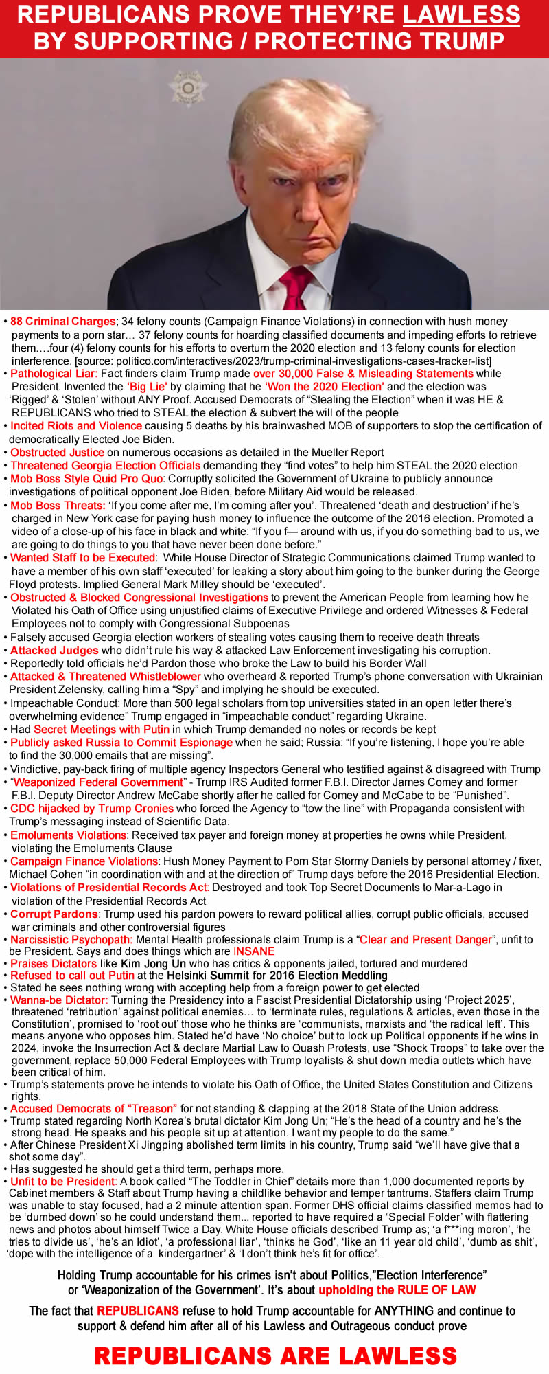 RNC REPUBLICANS ARE RESPONSIBLE due to enabling & sponsoring Trump as their Presidential candidate; a convicted criminal who violated his Oath of Office by pressuring Georgia Election officials to ‘find more votes’, a pathological liar who lied over 30,000 times while President and narcissistic psychopath who mental health professionals say is a ‘clear & present danger’, who Obstructed Justice on numerous occasions as detailed in the Mueller Report, who corruptly solicited the Government of Ukraine to publicly announce investigations into political opponent Joe Biden before Congressionally approved Aid would be released to Ukraine. Trump violated his Oath of Office by pressuring Georgia Election officials to “find 11,780 votes” to help him STEAL the 2020 election. Trump Incited Riots & Violence on J6 causing 5 deaths and injuries of numerous Capital Police by his brainwashed-with-lies mob of supporters. Trump was convicted on 34 Felony Counts of Falsifying Business Records to hide ‘Hush Money Payments’ to influence the outcome of the 2016 election and is a pathological liar who fact checkers say made over 30,000 false or misleading statements while President, from 2017 to 2021. The RNC legitimized all of this corrupt and outrageous conduct by enabling & sponsoring Trump as their Presidential candidate.