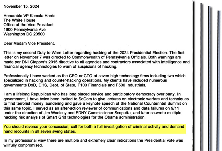 After the election was called for Trump, Computer Security Experts sent letters to Kamala Harris on November 13, 2024 and on November 15, 2024 detailing how the 2024 election could have been hacked and rigged by Trump operatives and recommended recounts in Swing States. Cyber Security Expert Stephen Spoonamore stated; “You should reverse your concession, call for both a full investigation of criminal activity and demand hand recounts in all seven swing states”.