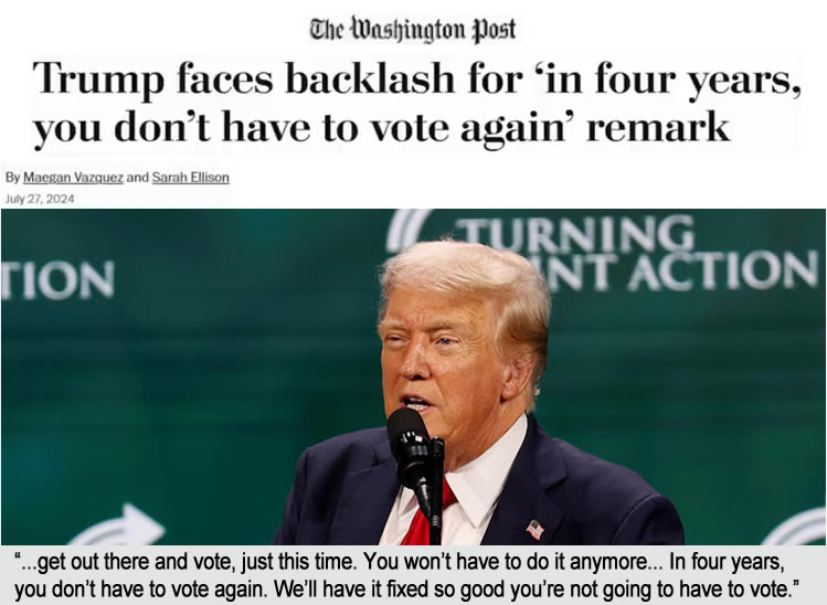 Trump admitted the 2024 election and future elections will be rigged when he said “I don’t need your votes”. “Get out and vote just this time…. you won’t have to do it anymore… we’ll have it fixed so good, in four years you don’t have to vote again”.