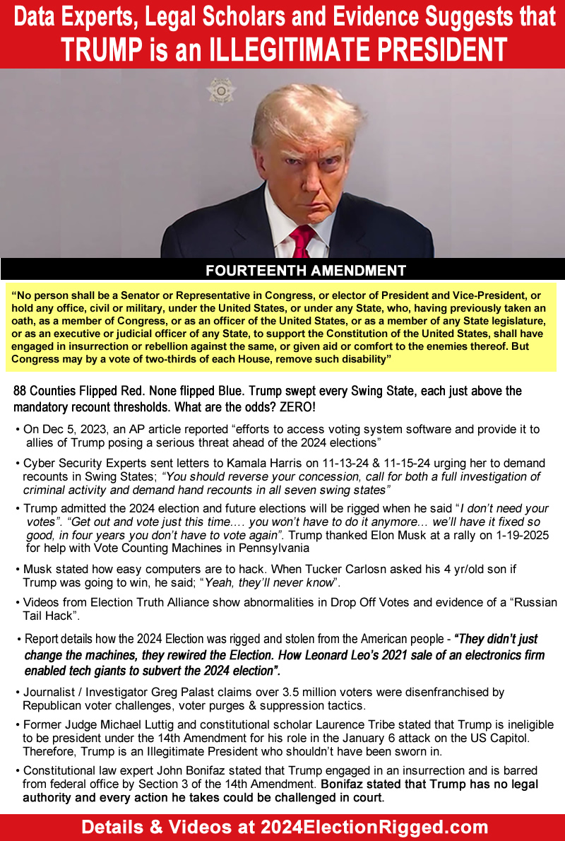 Millions of Americans knew in their guts there was something drastically wrong with the outcome of the 2024 Election, but the mainstream news media accepted the results without asking any questions and have continued legitimizing Trump’s Presidency by failing to report or discuss any of the issues raised by sources referenced on this page.