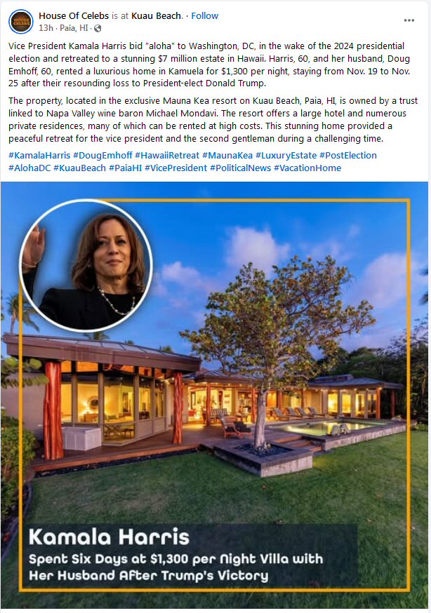 Instead of ‘Fighting’ to save our country by ordering recounts, Harris retreated to a 7 million dollar estate in Hawaii @ $1,300 per night. I will never forget or forgive what Harris did and will do everything in my power to make sure as many people as possible remember how she BETRAYED the people who voted for her and help put a lunatic back in the White House, who is destroying our country.