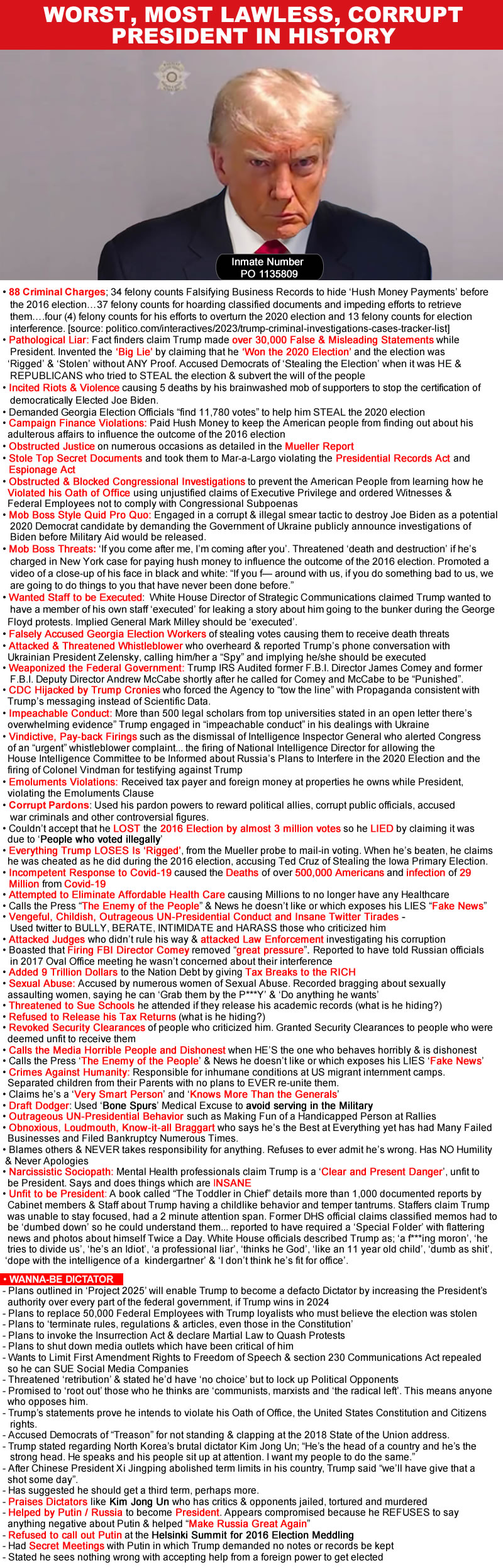 Every member of Congress who helped Trump to become President and Supreme Court Justice John Roberts who swore Trump in as President violated their own Oath of Office because Trump was disqualified by Section 3 of the 14th Amendment for inciting an Insurrection on J6, 2021. He also made it clear that he intended violate laws, the United States Constitution and Citizens Rights by threatening to lock up political opponents, go after people who criticized him, saying news outlets which criticized him should be shut down (proof he planned on violating the 1st Amendment), pursue revenge and retribution against those who held him accountable in the past and anyone who tries to hold him accountable in the future. Trump made more than 100 threats to prosecute or punish perceived enemies, therefore he should not have been sworn in as President [source: <em>100 Threats by Trump to prosecute enemies;</em> npr.org/2024/10/21/nx-s1-5134924/trump-election-2024-kamala-harris-elizabeth-cheney-threat-civil-liberties]