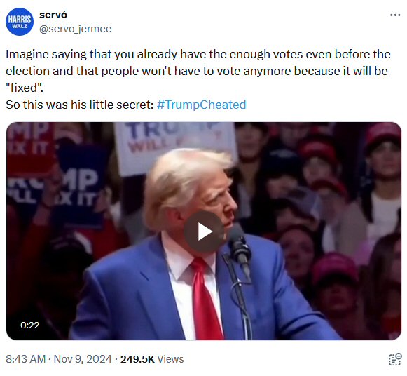 Trump admitted the 2024 election and future elections will be rigged when he said “I don’t need your votes”. “Get out and vote just this time…. you won’t have to do it anymore… we’ll have it fixed so good, in four years you don’t have to vote again”.