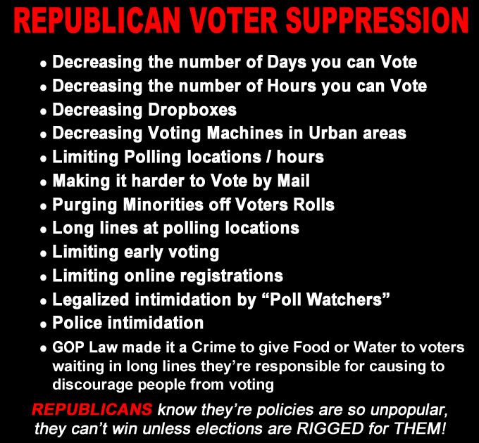 Republicans are LIARS who have NOTHING to offer except LIES, Divisive Social Issues, taking away Women’s Rights, Attacking / Demonizing LGBT’s, Cutting / Eliminating Medicare, Medicaid, Social Security, giving Tax Breaks to RICH, Rigging Elections by Gerrymandering, Voter Obstruction and other anti-democratic tactics to prevent people from voting who aren’t likely to vote for them.
