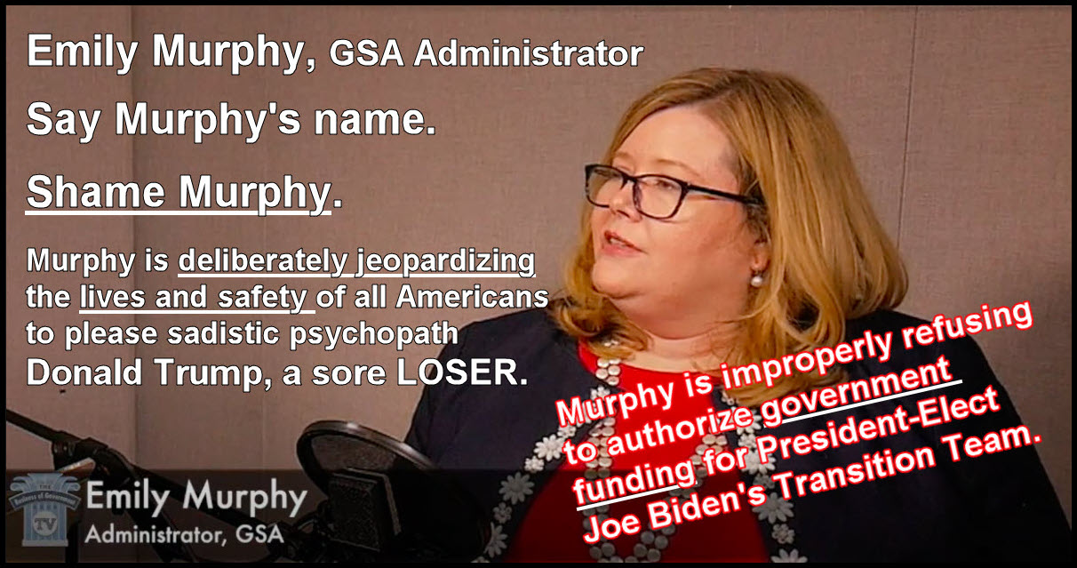 By Blocking Joe Biden’s Transition, GSA Official Emily Murphy is not only violating the will of the people but is in Violation of the Presidential Transition Act and should be held accountable.