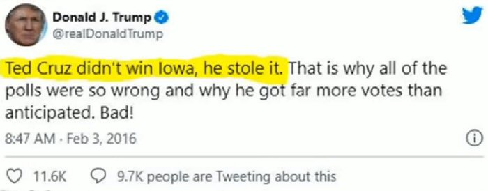Trump falsely accused Ted Cruz of “stealing” the 2016 Iowa Republican Primary and Ted Cruz’s father being involved in JFK’s assassination. In response, Ted Cruz calls Trump a “Pathological Liar who doesn’t know the difference between truth and lies” and claims Trump “is a narcissist at a level this country’s never seen”.