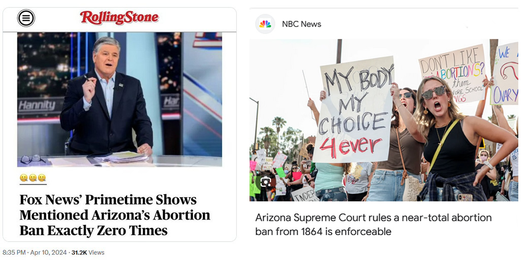 On April 9, 2024, when the Republican dominated Arizona Supreme Court ruled it would enforce a total Ban on Abortion based on a draconian law from 1864, it was the biggest story of the day, carried on every major news outlet. According to Rolling Stone Magazine, FOX hosts such as Sean Hannity and Jesse Watters mentioned it to their viewers ZERO times. This is how “News” outlets in Dictatorships such as Russia & North Korea functions and is a classic example of how FOX keeps their viewers in the dark about Republican’s restrictive and unpopular policies.