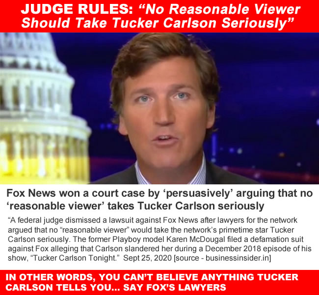 Per the above article; “You can’t expect to literally believe the words that come out of Carlson’s mouth. And that assertion is not coming from Carlson’s critics. It’s being made by a federal judge in the Southern District of New York and by Fox News’s own lawyers. U.S. District Judge Mary Kay Vyskocil’s opinion, leaning heavily on the arguments of Fox’s lawyers: The “‘general tenor’ of the show should then inform a viewer that [Carlson] is not ‘stating actual facts’ about the topics he discusses and is instead engaging in ‘exaggeration’ and ‘non-literal commentary. ”