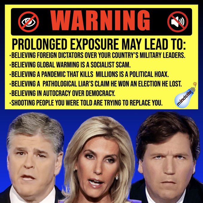 For years Rupert Murdoch, Sean Hannity, Tucker Carlson, Laura Ingraham & the rest of Fox News were enraging viewers on air, while laughing at them off-air. Their lies lead followers to mount a deadly attack on our Capitol.