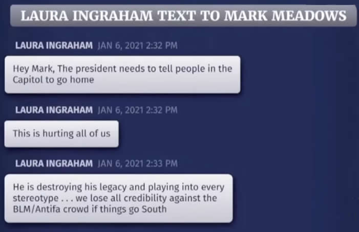 The January 6th committee revealed text messages in which Fox News hosts Laura Ingraham, Sean Hannity, and Brian Kilmeade begged Mark Meadows to get Trump to call off the riot while falsely claiming to their viewers that the rioters weren’t Trump supporters.