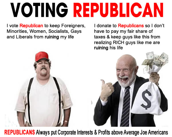 Per the above article; “The GOP exists to serve the interests of the wealthy and big business that comprise the richest 1%. No party, however, can ever win an election with only 1% of the vote. So to win elections, the GOP must necessarily reach beyond its own wealthy core and attempt to convince a large segment of working people in the 99% to vote for Republicans.