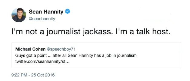 CNN’s Jake Tapper took a jab at Fox News’ Sean Hannity Thursday, suggesting the conservative TV personality isn’t much of a journalist.