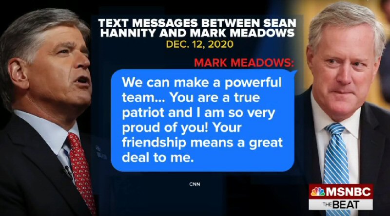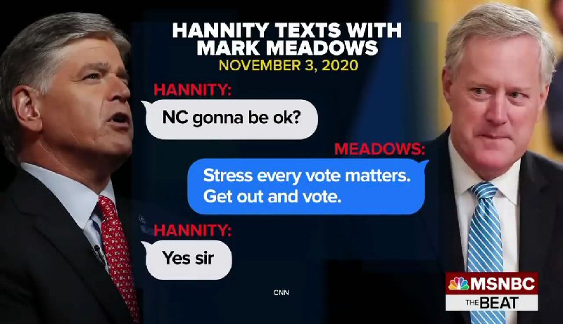 . In text messages between Sean Hannity and WH Chief of Staff Mark Meadows, Hannity replied with “Yes sir. On it” when ordered by Meadows on how to talk about the election.