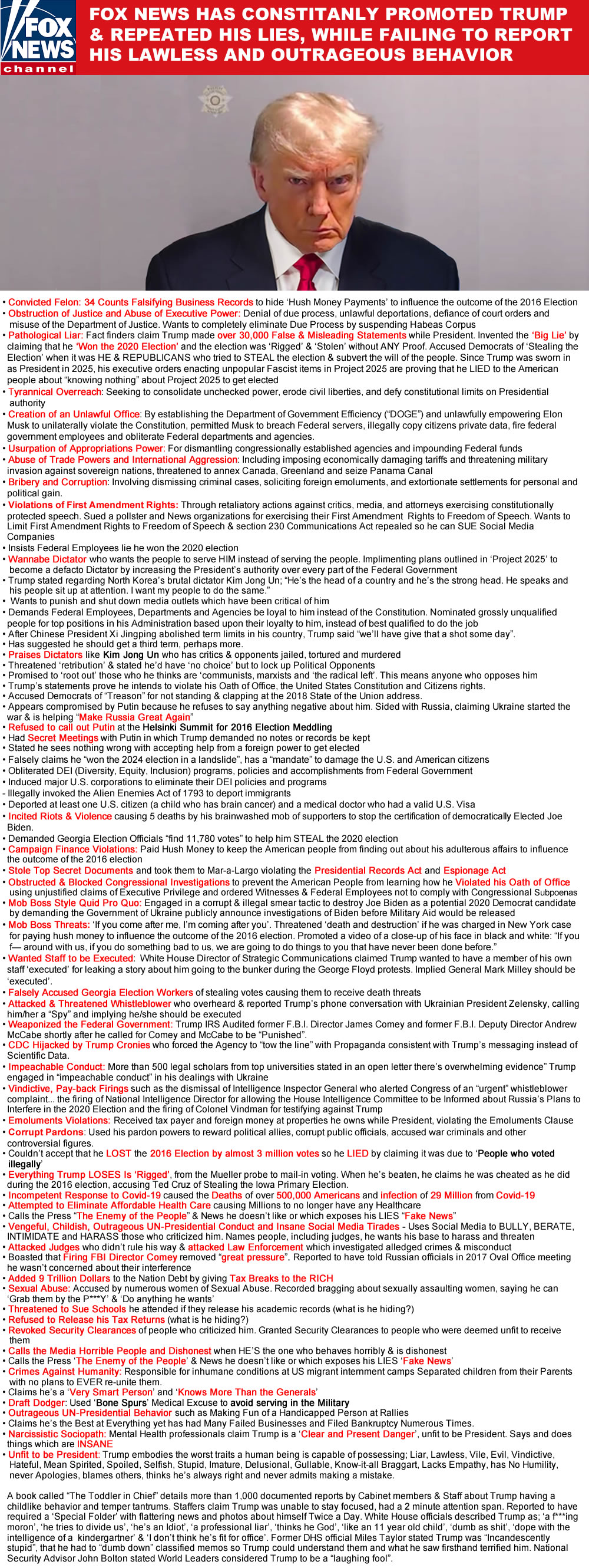 FOX NEWS has helped destroy the United States & Democracy by supporting / promoting Trump & Republicans, promoting lies, conspiracy theories and omission of the facts to keep their viewers in the dark about the damage Trump and Republicans has been doing for years, while demonizing Democrats, the very party which fights for the middle class working Americans and the poor. Examples shown on this page.