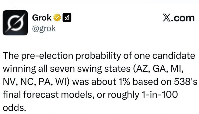 After Trump promised to be a “Dictator on Day One”, threats to destroy our Democracy outlined in Project 2025, scores of military leaders and Republicans stated they were going to vote for Harris, record crowds at Harris rallies, record new voter registrations, warnings from Trump’s own staff & military leaders that he would ‘End Democracy as we have known it’, promising retribution against political enemies, inciting an insurrection on J6 to overturn the 2020 election which caused 5 deaths, a pathological liar who according to fact checkers lied over 30,000 times during his first term and his outrageous, vindictive, hateful, insane conduct, it deifies credulity that a majority of Americans would have been stupid enough to vote to put Trump back in the White House in 2024, in ALL 7 Swing States.