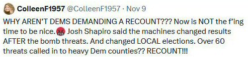 Posts all over social media show Americans knew something was drastically wrong, but Kamala Harris, Democrats, the Mainstream News Media and a large portion of the population accepted the results without asking any questions and have continued legitimizing Trump’s Presidency by failing to discuss or speak out about any of the issues which were apparent after the election was called for Trump.