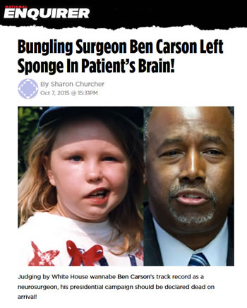 When Ben Carson overtook Trump as the GOP front-runner, the Enquirer published a cover story on Carson headlined “Bungling Surgeon Ben Carson Left Sponge in Patient’s Brain!” The article called Carson a “White House wannabe” and claimed he “brandished a scalpel like a meat cleaver!”