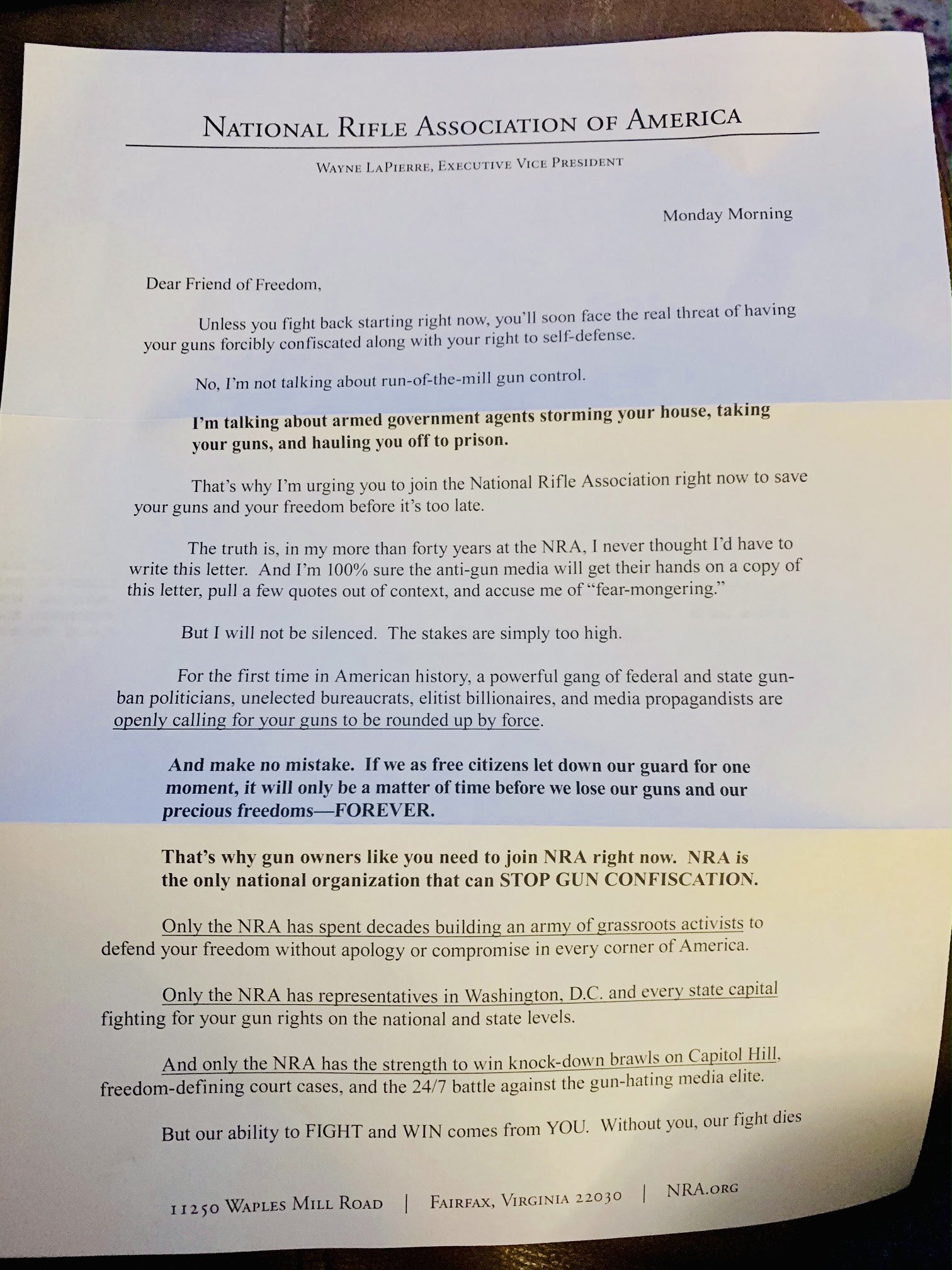 Two days before the deadly riots at the Capitol, the NRA sent a letter to its members claiming that under the Biden administration, armed government agents would “storm your house, take your guns and haul you to prison.”