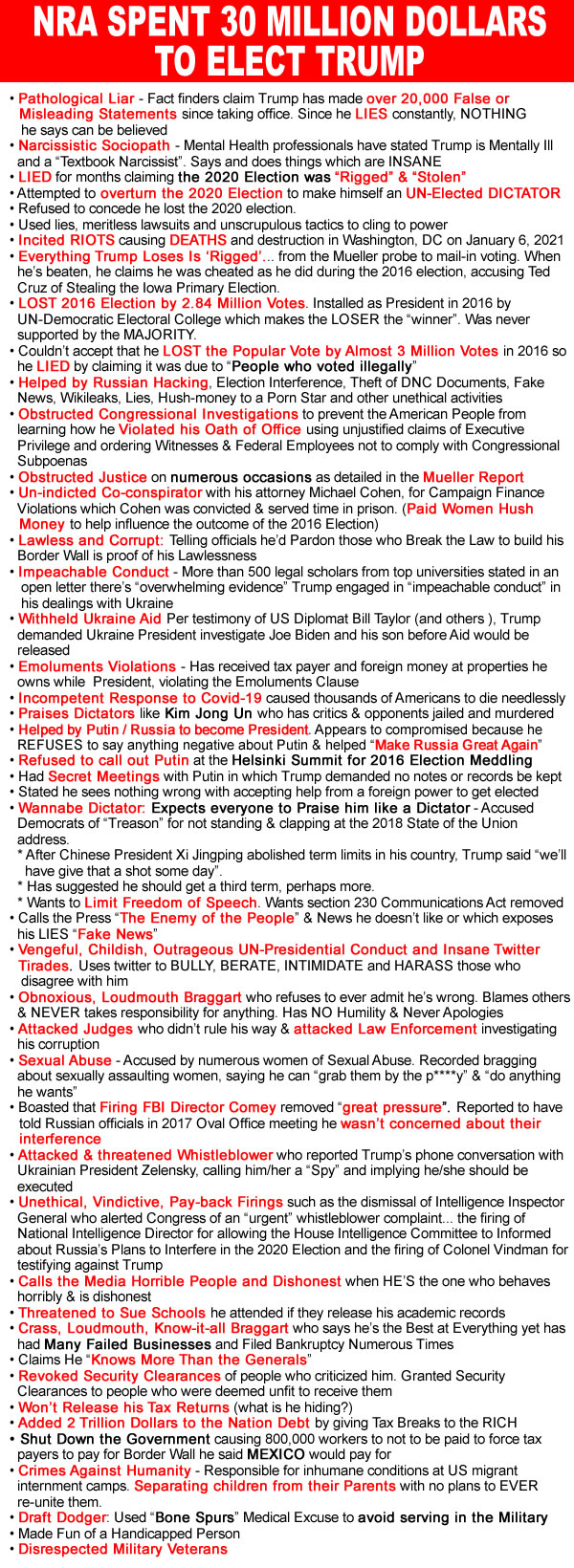 The NRA supported and gave donations to Trump & Republicans who LIED about the 2020 election being rigged & stolen, then engaged in a coup d’etat to overturn the election to make Trump an UN-Elected DICTATOR by inciting violence, chaos and rioting in Washington, DC. Rioters stormed the House & Senate chambers, wrecking havoc, destruction and deaths at the United States Capital.