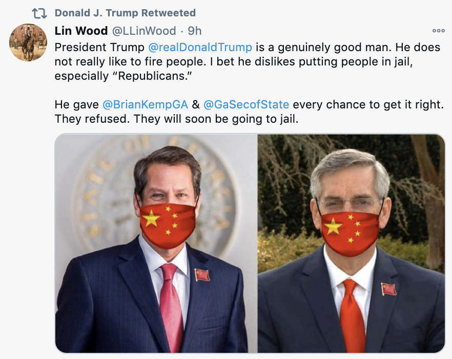 What “crime” has Governor Brian Kemp committed that he should be “locked up“? Refusing to RIG the election for Trump?