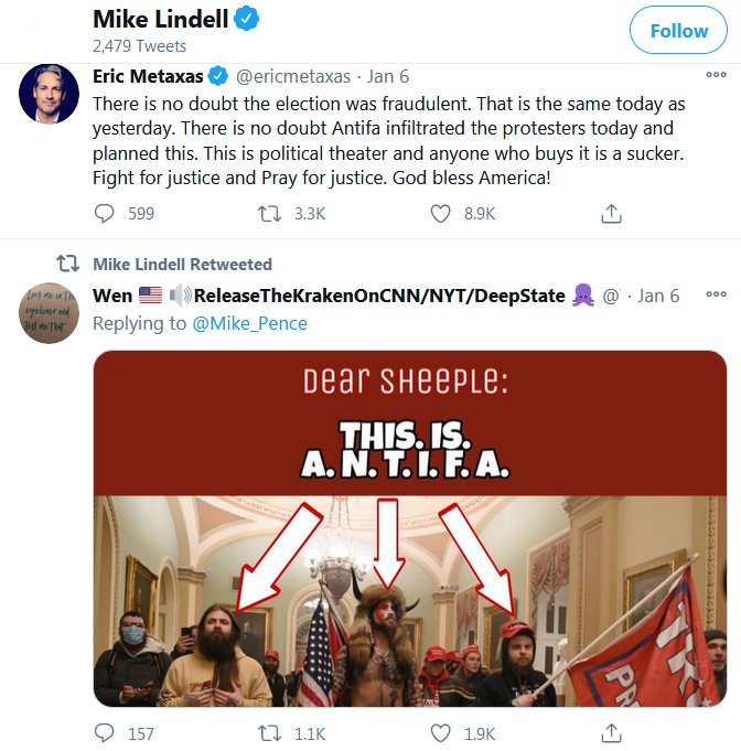Here’s a retweet from a well known Republican and Trump supporter (owner of My Pillow) attempting to pin the blame on Antifa, instead MAGA Domestic Terrorists, where it belongs.