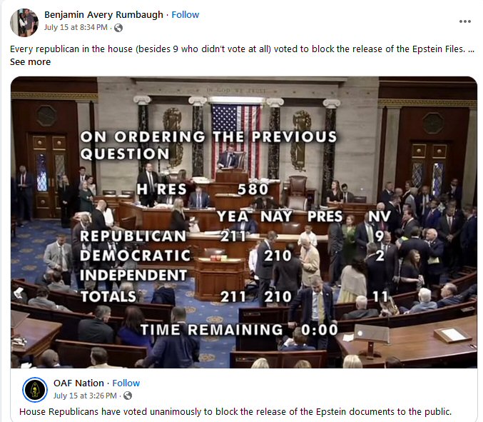 LAWLESS, Scum of the Earth Republicans Vote NOT release the Epstein Files to protect Trump and keep his SECRETS HIDDEN from the American people