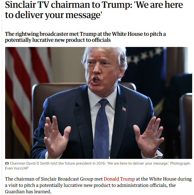 According to the above article published in 2016, Chairman of Sinclair Broadcasting Group, David D Smith told Trump’s campaign in 2016: ‘We are here to deliver your message’. David D. Smith is reported to be a prominent donor to Republican causes and Trump supporter.