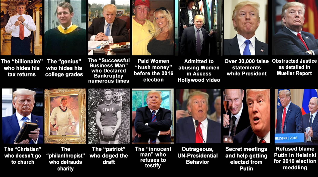 • Pathological LIAR: Fact checkers claim Trump made over 30,000 false or misleading statements while President. Claimed he “Won” the 2020 Election and it was “Stolen”. Accused Democrats of “Stealing the election” when it was HE & REPUBLICANS who tried to STEAL the election & subvert the will of the people.