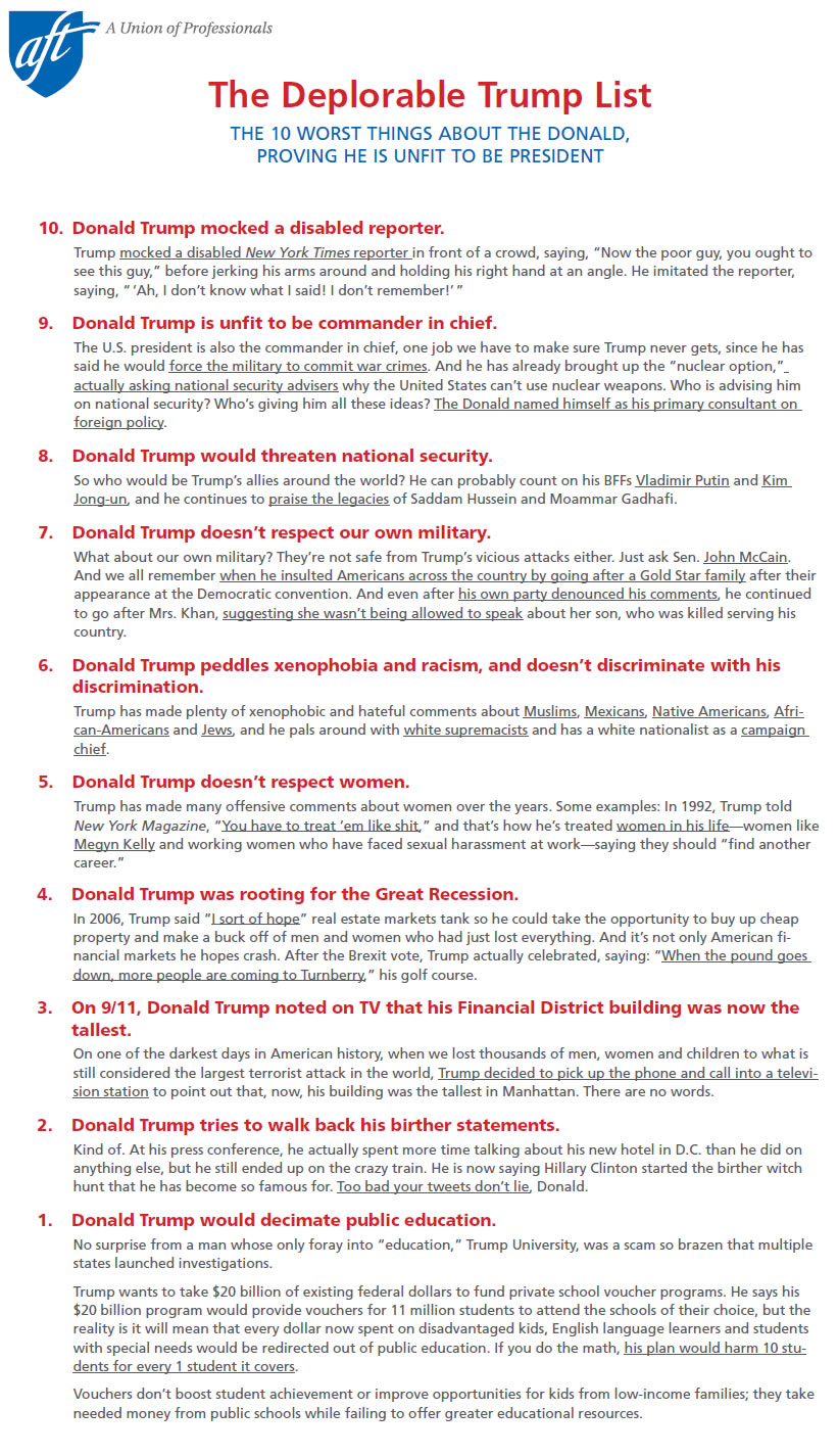 • Draft Dodger: Used ‘Bone Spurs’ Medical Excuse to avoid serving in the Military • Outrageous UN-Presidential Behavior such as Making Fun of a Handicapped Person at Rallies
