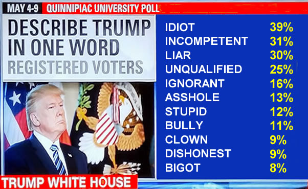 The answers given was idiot, incompetent, liar, unqualified, arrogant, egotistical, ignorant, asshole, bully, clown and stupid.