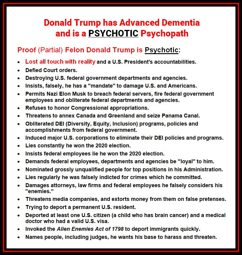 Trump has incited his followers to violence, consistently misconstrues reality, brags about his sexual assaults, and is unable to respond calmly to any criticism. He has the nuclear codes, has threatened to use them, and taunts hostile nations about the size of his button.