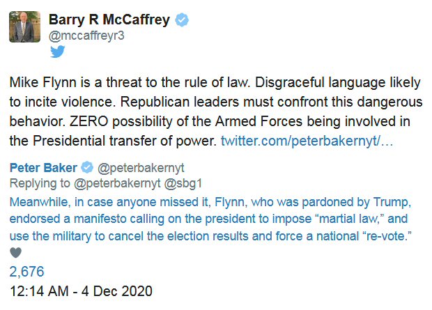 Four Star General Barry R McCaffrey stated in the above post; Mike Flynn is a threat to the rule of law. Disgraceful language likely to incite violence. Republican leaders must confront this dangerous behavior. ZERO possibility of the Armed Forces being involved in the Presidential transfer of power.