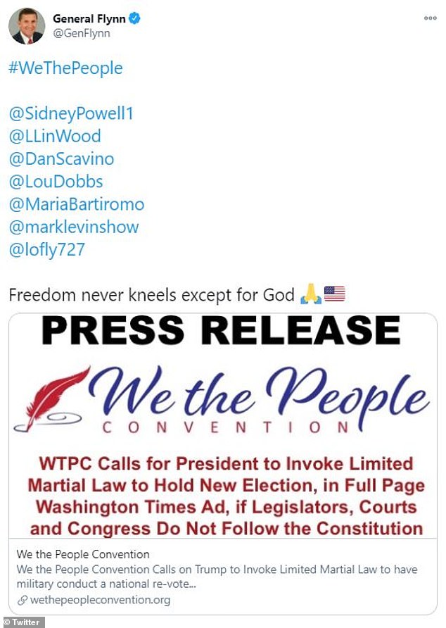 On December 2, he retweeted an account that shared an article that said former national security adviser Michael Flynn had shared a petition that called for martial law. He then retweeted the same account which suggested that Trump should declare martial law.