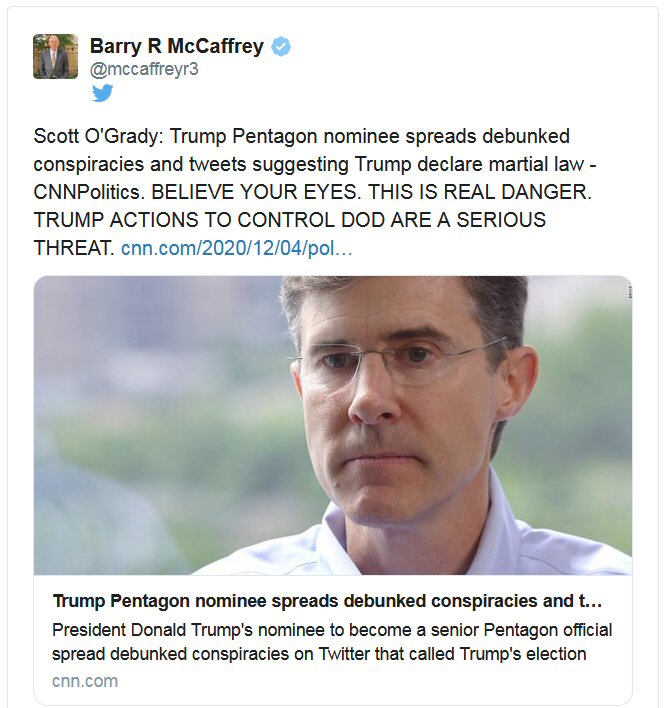 Four Star General Barry R McCaffrey stated in the above post; “Scott O’Grady: Trump Pentagon nominee spreads debunked conspiracies and tweets suggesting Trump declare martial law – CNNPolitics. BELIEVE YOUR EYES. THIS IS REAL DANGER. TRUMP ACTIONS TO CONTROL DOD ARE A SERIOUS THREAT”.