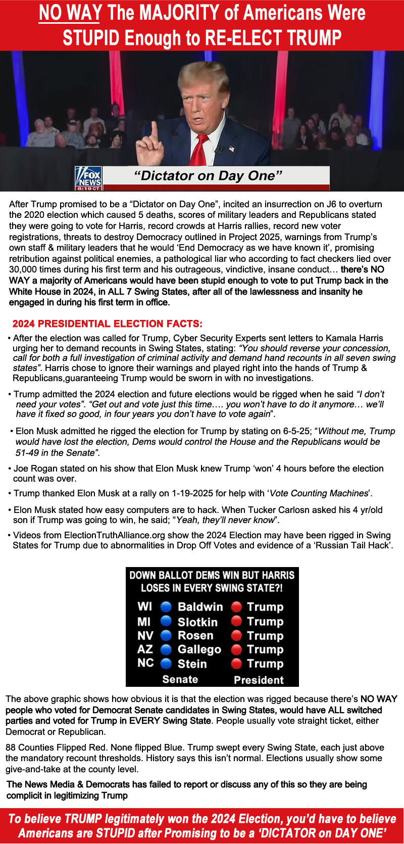 On July 30, 2024, Rachel Maddow was the first national person to point out how Trump said; “I don’t need your votes…. get out and vote just this time…. you won’t have to do it anymore… we’ll have it fixed so good you’re not going to have to vote anymore.”  After the 2024 election, she never mentioned it again, which makes one wonder if there’s a ‘NEWS BLACKOUT’ in which everyone in the media is being told to not question or discuss the outcome of the 2024 election.